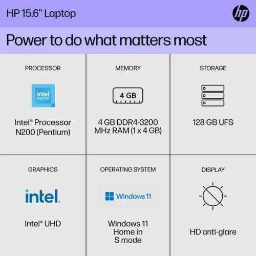 HP 15 Laptop 15.6″ HD Pentium Quad-Core N200 4GB 128GB UFS Webcam Win 11 Silver