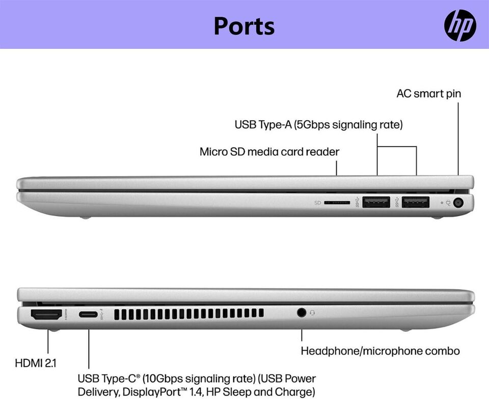 | PortsSlots | 2 x USB 3.2 Type-A, 1 x USB Type-C, 1 x Micro SD media card reader, 1 x AC smart pin, 1 x HDMI 2.1, 1 x Headphone/microphone combo |