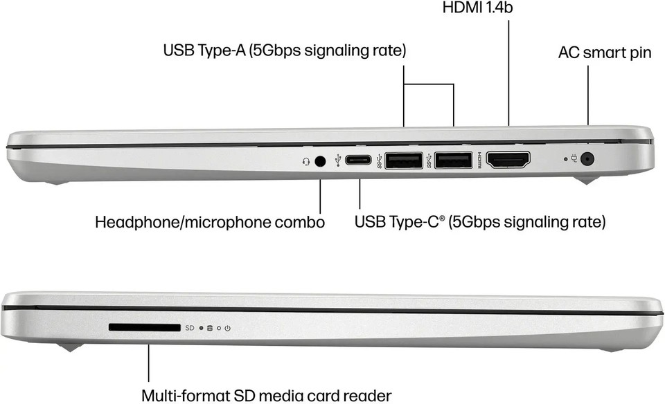| PortsSlots | 1x USB Type-C 5Gbps signaling rate (supports data transfer only and does not support charging or external monitors), 2x USB Type-A 5Gbps signaling rate, 1x Headphone/microphone combo, 1x AC Smart pin, 1x HDMI 1.4b, 1x multi-format SD media card reader |