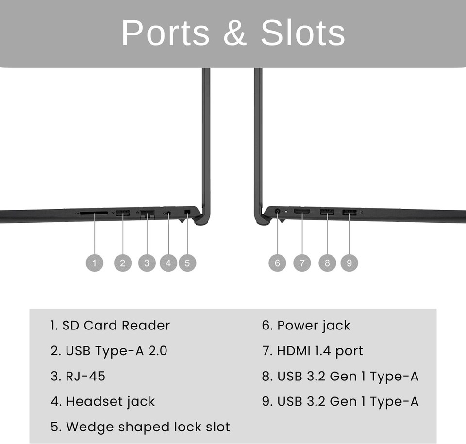| PortsSlots | 1x USB 3.2 Gen 1 Type-C port with DP 1.4 , 1x USB 3.2 Gen 1 port , 2x USB 3.2 Gen 1 port , 1x USB 2.0 port, 1x headphone and microphone combo port, 1x HDMI 1.4 port, 1x RJ45 Ethernet port (flip-down) |