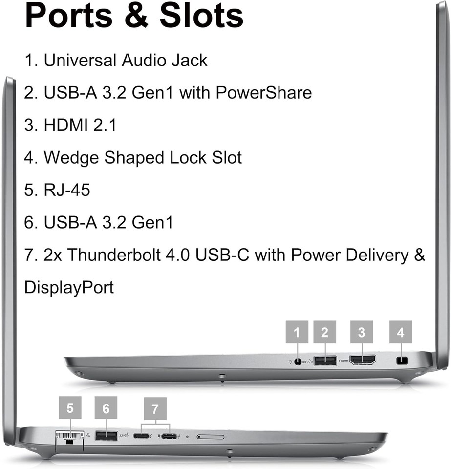 | PortsSlots | 2x Thunderbolt 4 with DP Alt Mode/USB Type-C/USB4/PD, 1x USB 3.2 Gen 1 with PowerShare 1x USB 3.2 Gen 1 port, 1x HDMI 2.1 , 1x universal audio port, 1x RJ45, 1x Nano SIM tray |