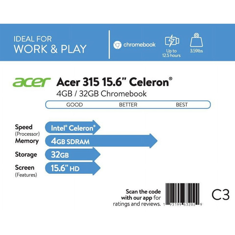 New Acer Chromebook 315 15.6″ HD Dual-Core N4000 4GB 32GB eMMC Chrome OS Sleeve