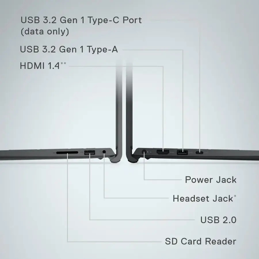 | PortsSlots | 1x USB 3.2 Gen 1 Type-A port, 1x USB 3.2 Gen 1 Type-C (data only), 1x USB 2.0 port, 1x Headset jack, 1x HDMI 1.4 port, 1x SD-card slot |